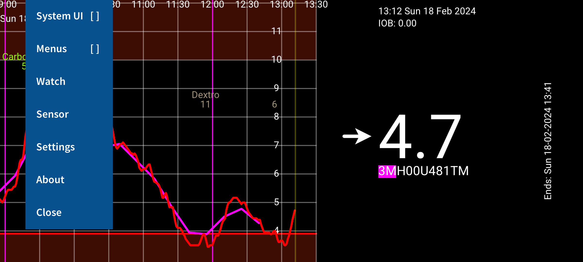 In the left menu, you can find Settings, to set the glucose unit to mmol/L or mg/dL, to specify labels, set glucose alarms and medication reminders and display ranges. System UI determines if Android controls and status bar are shown. In Watch you can specify Juggluco to send data to all kinds of smartwatches. In Sensor, you can see how the connection with the sensor is going. Touch Menus to show all the mentioned menus at the same time in a way that can be read by talkback. Close can be used to exit Juggluco.
