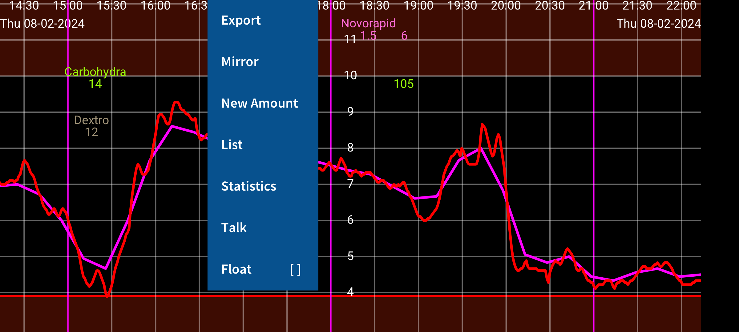 You can enter these numbers by touching New Amount in left of the middle menu. Export saves data in .tsv (tab separated values) format to a file. Mirror makes it possible to send data via IP/TCP to this app running on a different device to display the same information. List gives a list of the entered numbers. If Juggluco has received enough glucose values via Bluetooth, you can see some statistics by touching Statistics. It shows the percentage of the measurements in certain glucose ranges, the Glucose Management Indicator (a predictor of HbA1c), glucose variability and a summary graph showing the glucose value below which 100%,95%,75%,50%,25% and 0% of the values lie at each moment of the day. In Talk you can make Juggluco speak out incoming glucose values, touched elements of the graph or messages. Float turns on Floating Glucose. A glucose value present on the screen above other apps. In Settings you can change its color and size.