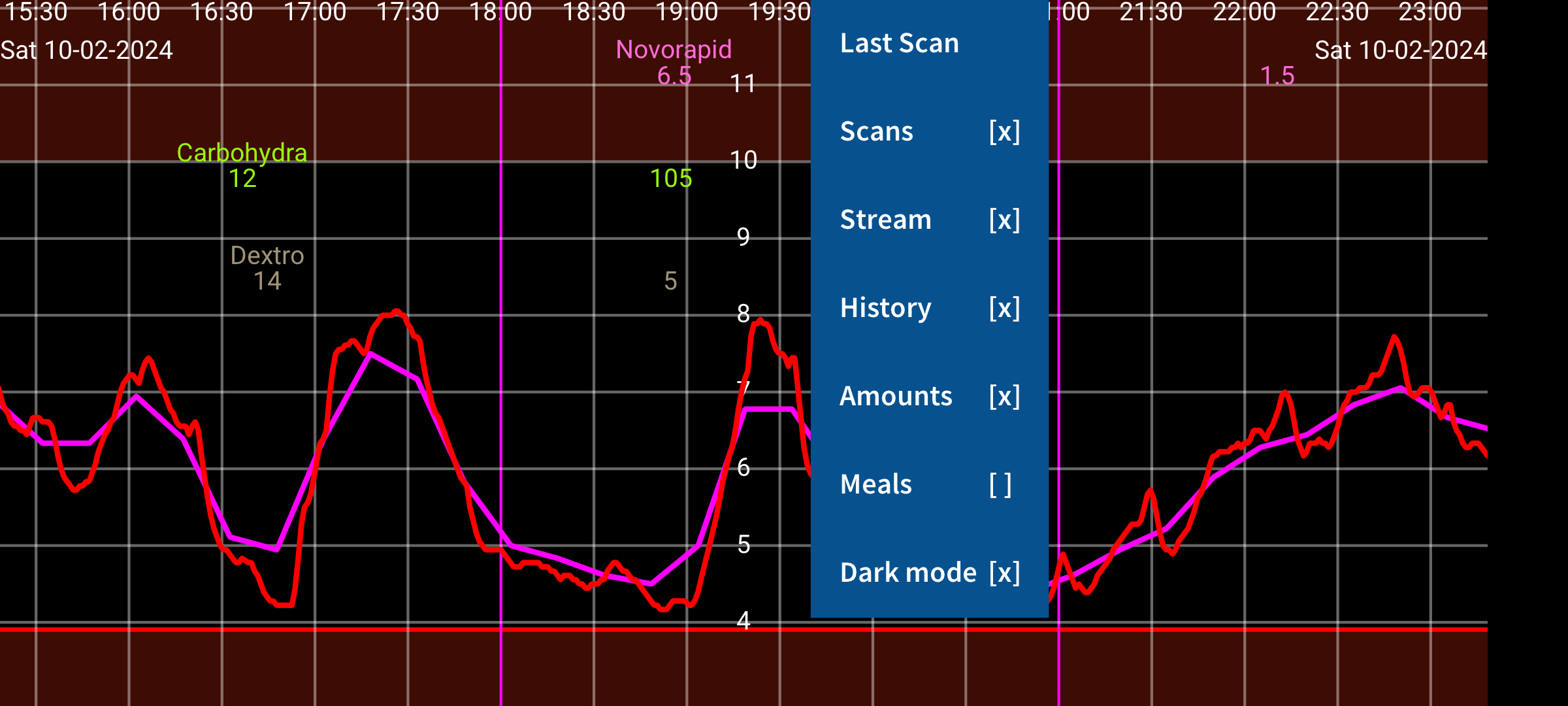 The right of the middle menu contains display options. To view the last scan, touch the first item. A cross after Scans means that scans are displayed in the graph. A scan is the current glucose value you get when you scan a Libre 0 or 2 sensor. Scanning also transfers 15 minutes measurements of the last 8 hours from sensor to smartphone. Display of these values can be controlled by touching History. Libre 3 sensors send the history values by Bluetooth and they are every 5 minutes. Stream stands for glucose values sent every minute via Bluetooth from a Freestyle Libre 2 and 3 sensors to this applet.