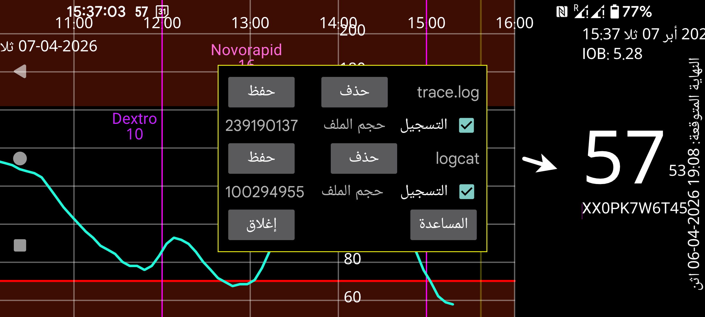 يحتوي trace.log على رسائل السجل التي ينشئها Juggluco نفسه. ويحتوي logcat.txt على رسائل السجل التي ينشئها Android فيما يتعلق بـ Juggluco. ويمكنك حذفهما أو حفظهما كلٌّ على حدة.