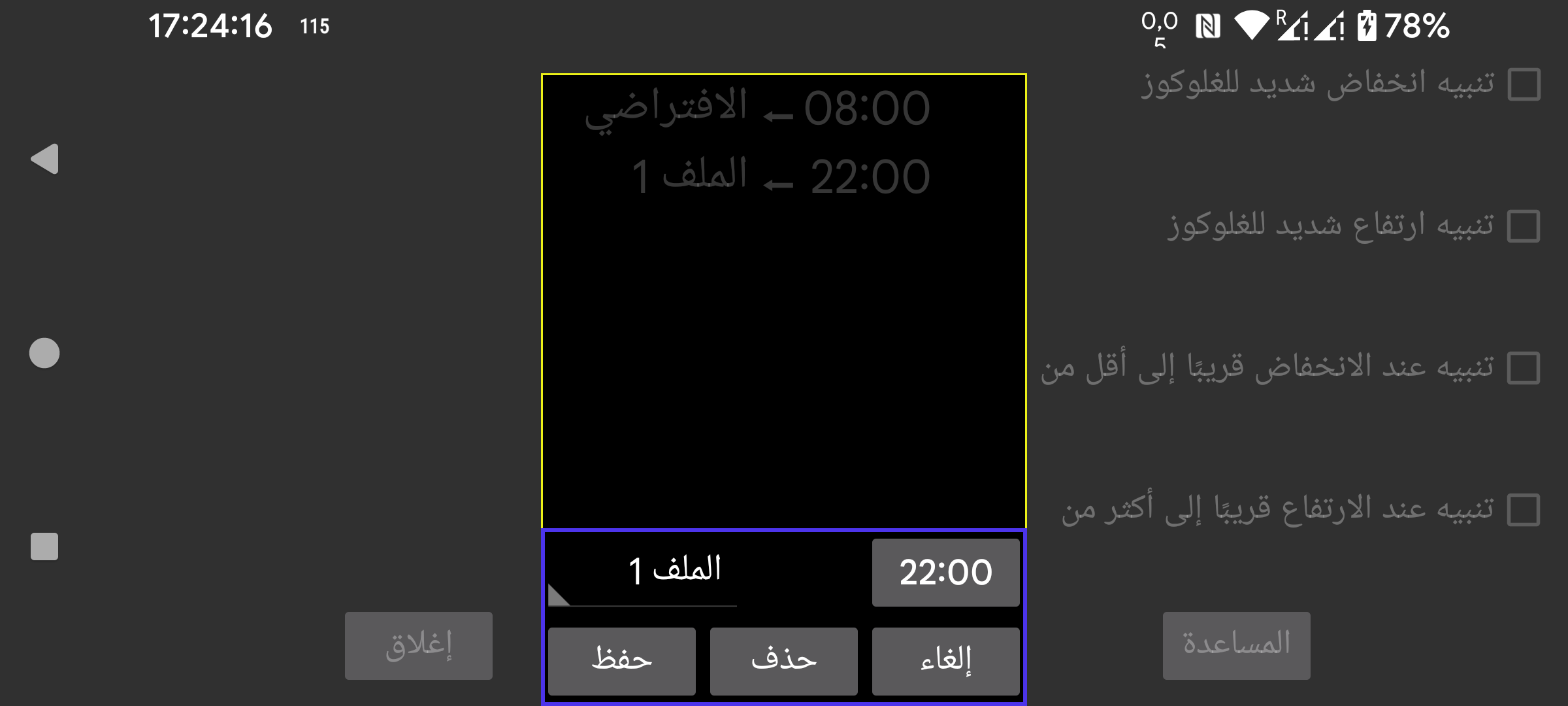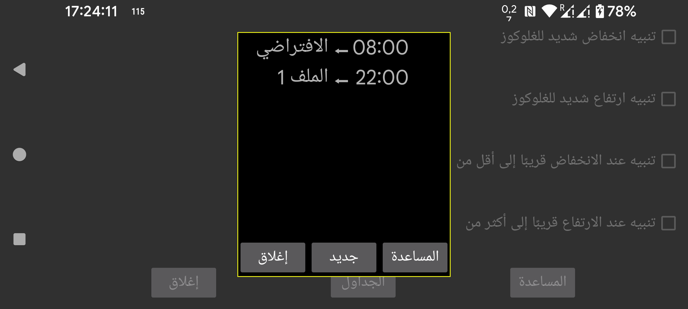 يمكنك جدولة تفعيل الملفات في وقت معيّن. اضغط «جديد» لإنشاء ارتباط بين وقت معيّن وملف معيّن. سيحوّل Juggluco كل يوم إلى ذلك الملف في الوقت المحدد. ويمكنك تعديل هذا الارتباط بلمسه.