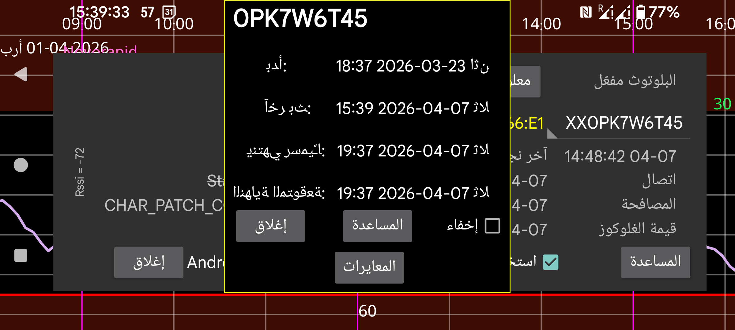 تفعيل: بالنسبة إلى المستشعرات المنتهية، يظهر زر «تفعيل». بالضغط على هذا الزر يمكنك استخدام المستشعر مرة أخرى من دون مسح مصفوفة البيانات الموجودة على العبوة. يمكنك أيضًا استخدامه مع مستشعرات Libre 2 وLibre 3، ولكن إذا كنت قد مسحت المستشعر بواسطة Juggluco على هاتف آخر، فستحتاج دائمًا إلى مسح المستشعر مرة أخرى عبر NFC لاستعادة المستشعر.