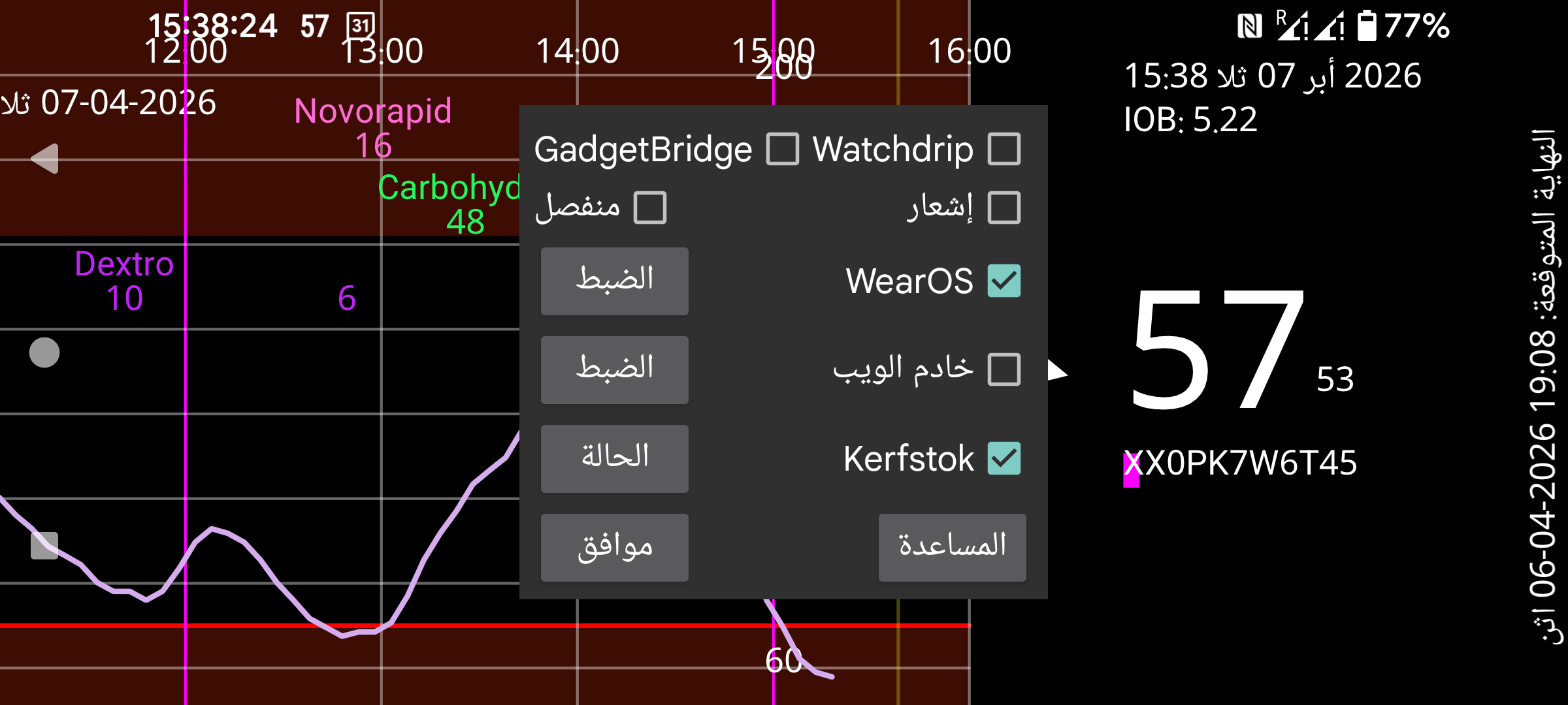 Kerfstok هو تطبيق ساعة يتيح لك إدخال الكميات (مثل جرعات الأنسولين)، لكنه يعرض أيضًا قيمة الغلوكوز الحالية. وفور وصول قيمة غلوكوز جديدة، يرسلها Juggluco إلى Kerfstok. ولذلك يعرض Kerfstok دائمًا أحدث قيمة غلوكوز. ويمكن لـ Kerfstok أيضًا تسجيل جميع الأنشطة التي تدعمها Garmin وعرض السرعة والمسافة. انظر الساعة->حالة Kerfstok->المساعدة وhttps://www.juggluco.nl/Kerfstok