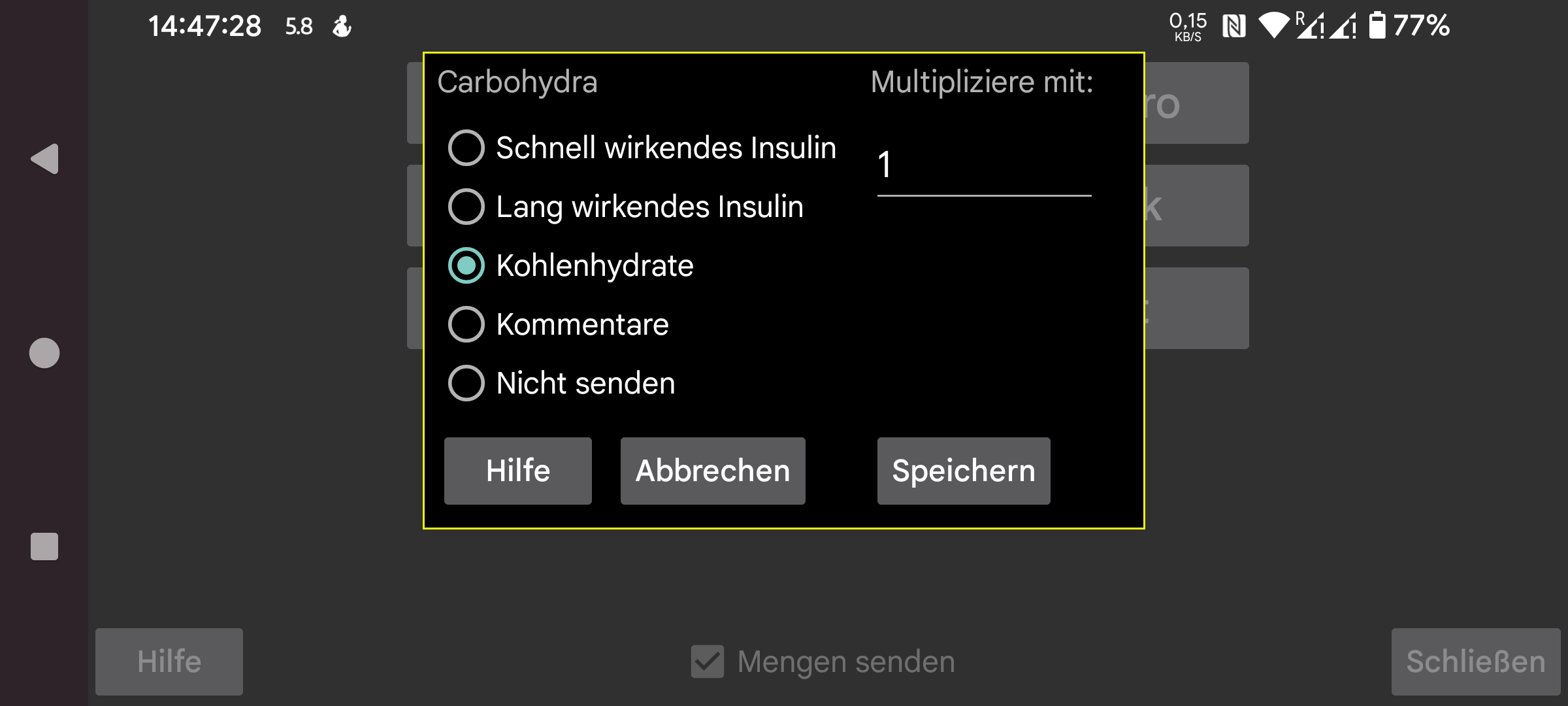 Wählen Sie aus, wie die unter einem bestimmten Etikett eingegebenen Mengen in Juggluco an Libreview gesendet werden sollen. Es ist möglich, mehr als eine Mengenart mit demselben Libreview-Etikett zu senden. Wenn Sie beispielsweise Kohlenhydrat- und reine Glukose-Lebensmittel unter separaten Etiketten in Juggluco bewerten, können Sie für beide angeben, dass sie als Kohlenhydrate an Libreview gesendet werden sollen.