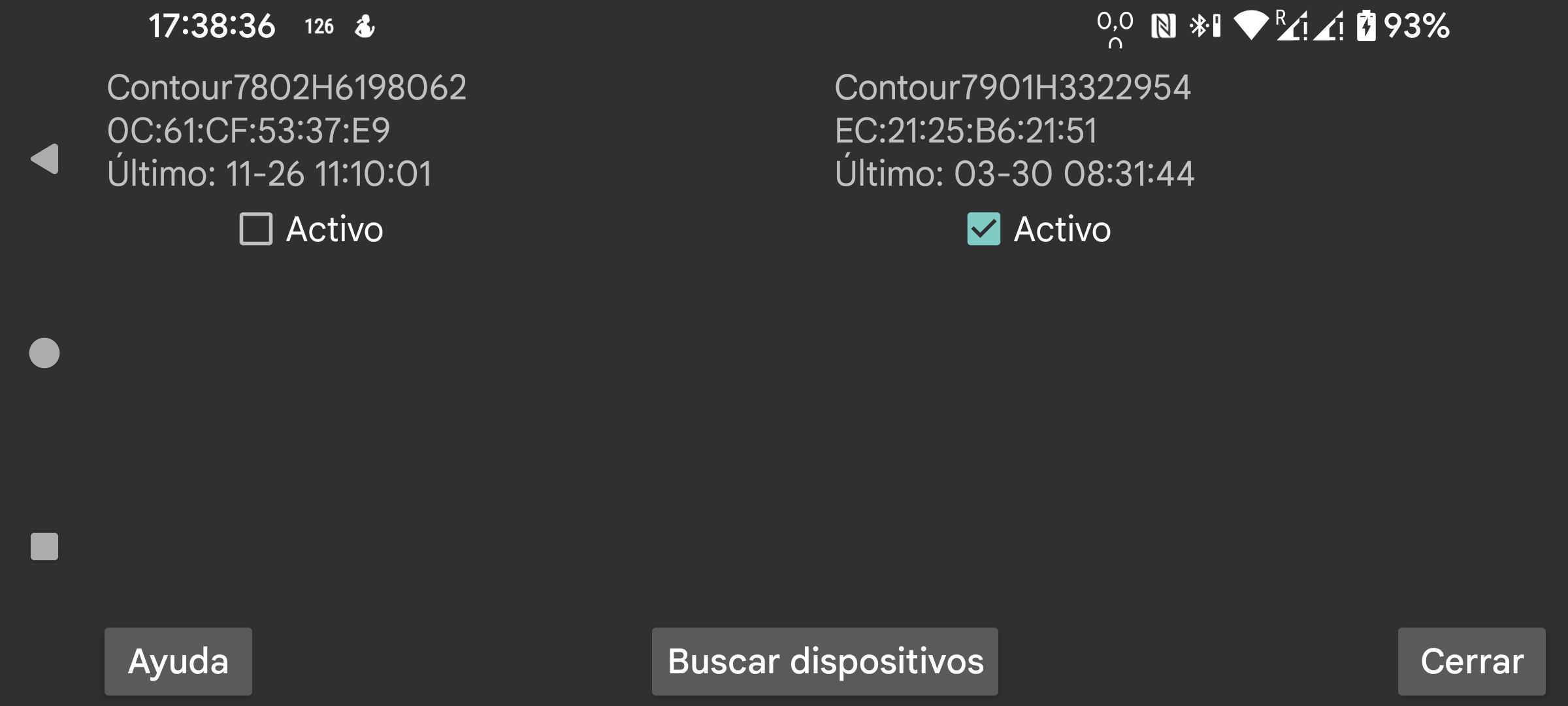 Para cada glucómetro se muestran el nombre del dispositivo y su dirección. También puedes verlos en Dispositivos conectados en los ajustes de Android.