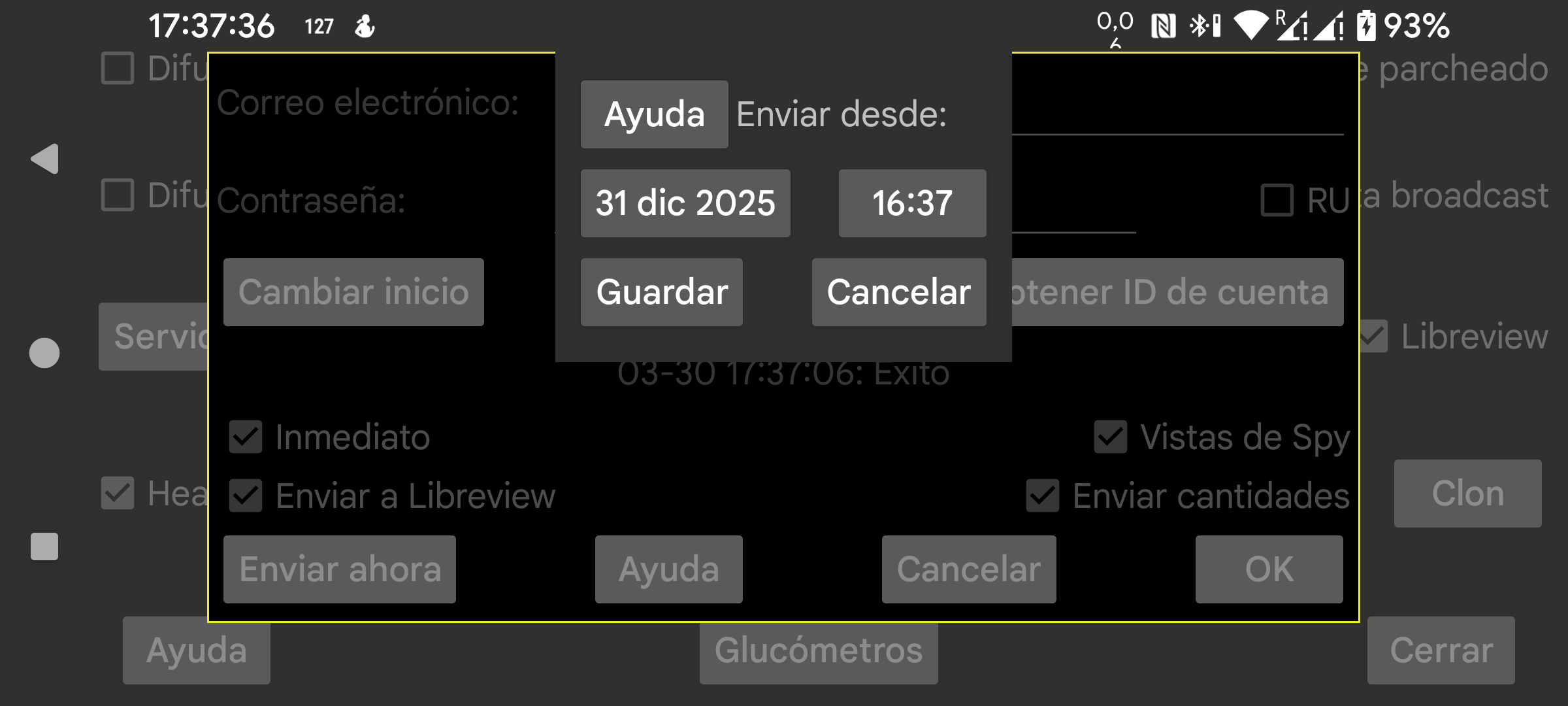 Cambia la fecha y la hora a partir de las cuales se envían datos a Libreview. Esto puede ser útil si algunos datos ya están presentes en Libreview, por ejemplo después de usar una conexión clon para transferir datos a otro teléfono y luego usar ese nuevo teléfono para enviarlos a Libreview.