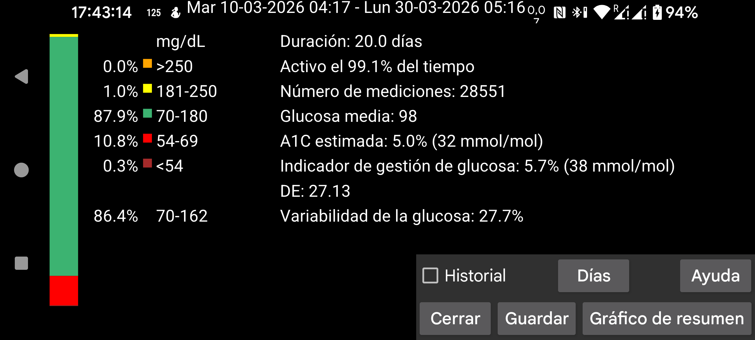 El número de días analizados puede cambiarse con el botón Días. El periodo analizado termina en la hora mostrada en el borde derecho de la pantalla y se extiende hacia atrás el número de días indicado. Para estas estadísticas solo se usan valores de glucosa de Stream.