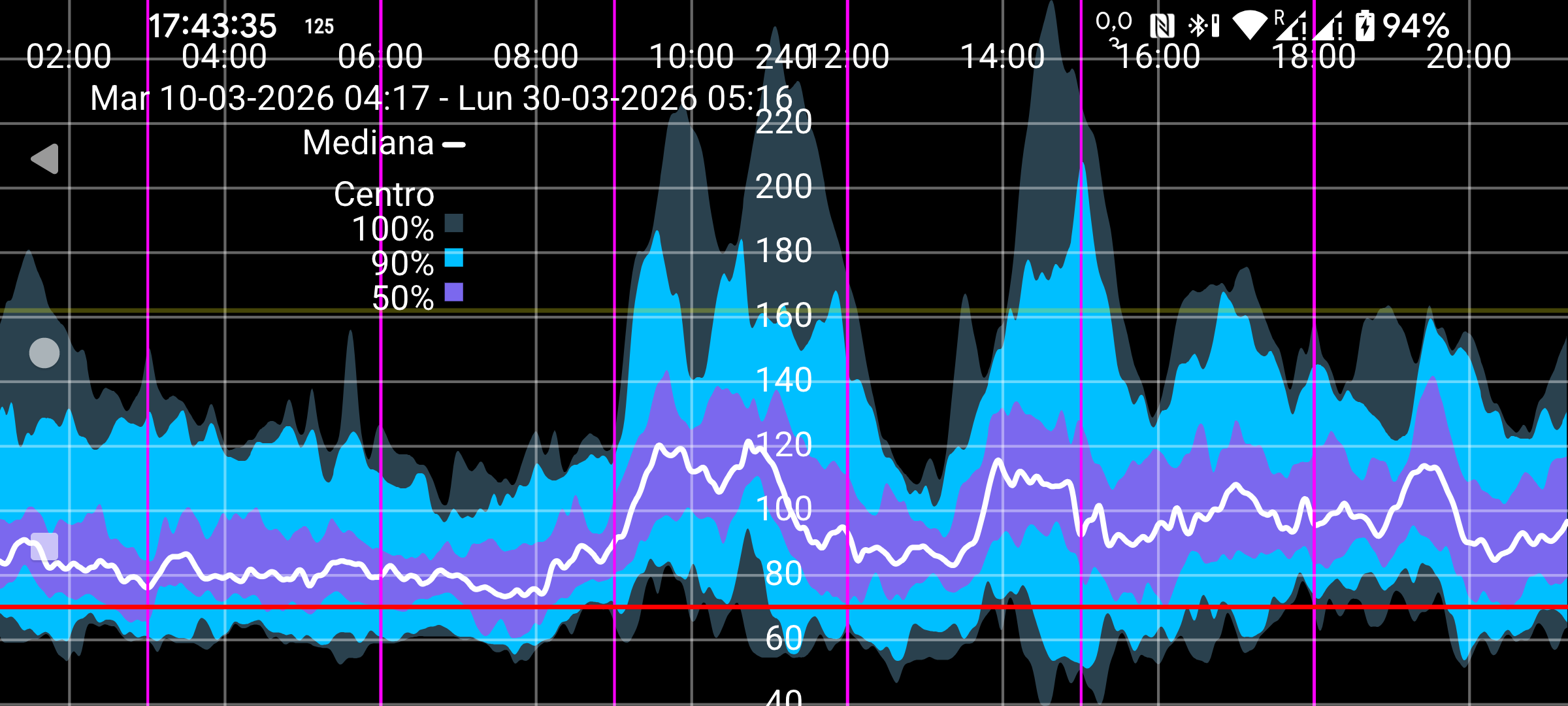 Para que se muestre, deben existir al menos 9 días de valores de Stream. Se utilizan todos los valores de Stream del periodo correspondiente para determinar, para cada minuto del día, cómo se distribuyeron los valores de glucosa. La mediana es el valor por debajo del cual cae el 50 % de los valores para cada minuto del día. El azul más claro representa el área donde se encuentra el 100 % de los valores. Un azul algo más oscuro representa el área alrededor de la mediana que contiene el 90 % de los valores. El azul más oscuro contiene el 50 % de los valores.