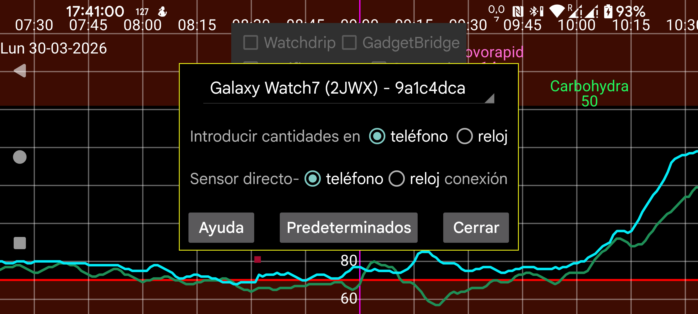Esfera: Juggluco para Wear OS incluye una esfera que muestra el valor actual de glucosa junto a la hora y hasta cuatro complicaciones. Normalmente verás los valores más recientes cuando se despierte la pantalla. En modo always on, la pantalla solo se actualiza una vez por minuto. Las esferas programadas de este tipo no pueden usarse en WearOS 5.