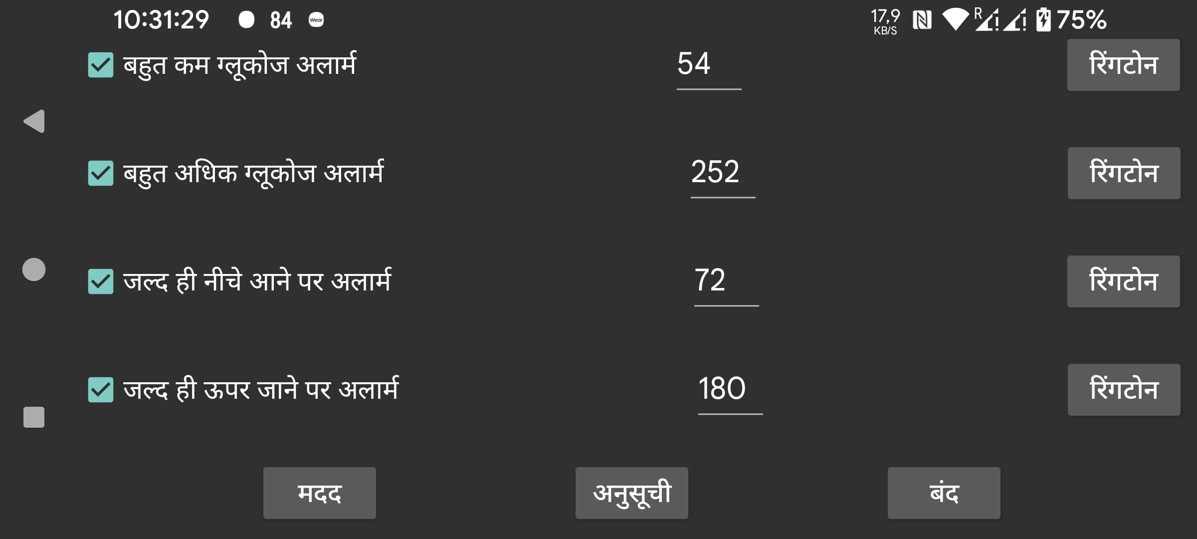जब बढ़ता ग्लूकोज जल्द ही किसी मान से ऊपर होने वाला हो तब अलार्म।