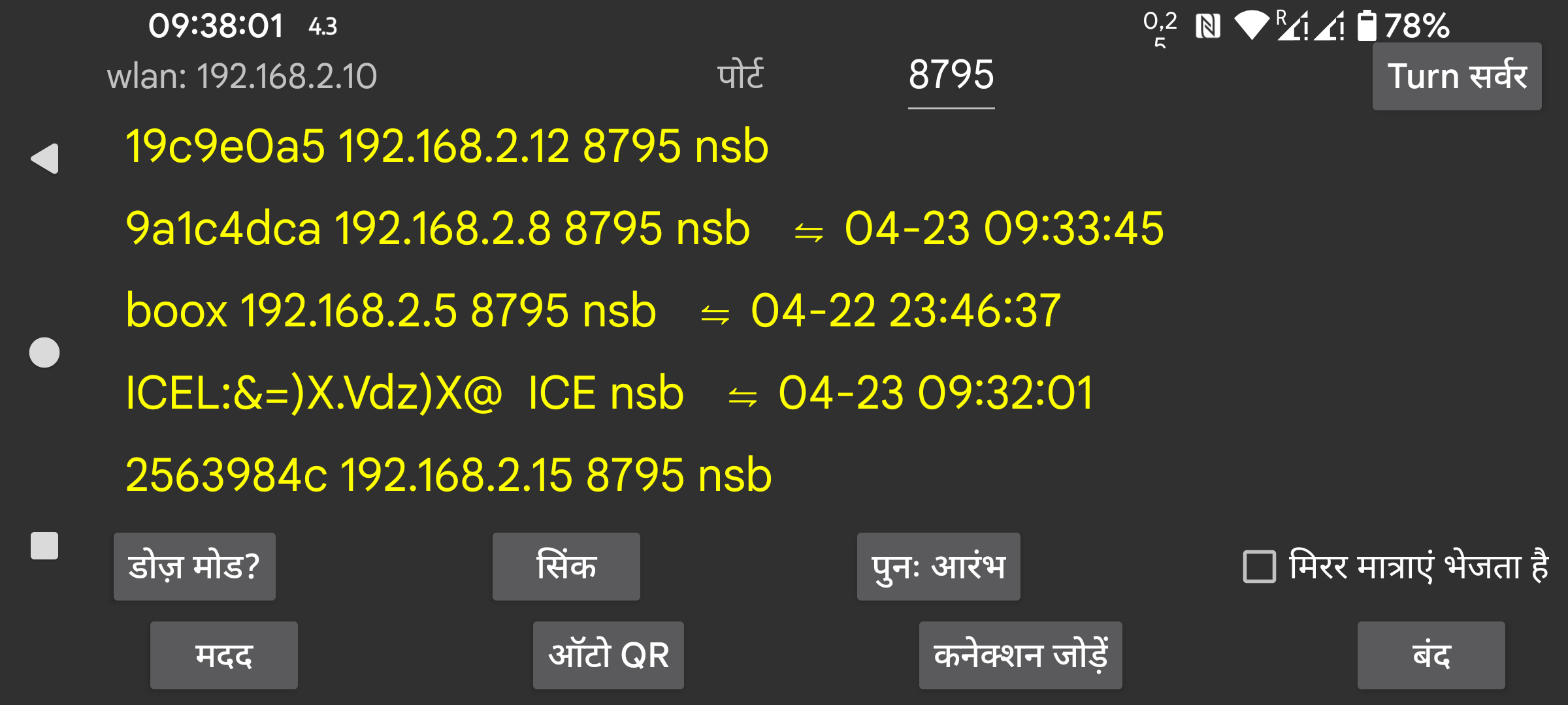 मौजूदा कनेक्शन एक सूची में दिखाए जाते हैं, लेबल, IP पोर्ट और अंतिम सफल सिंक का महीना, दिन और समय दिखाया जाता है।