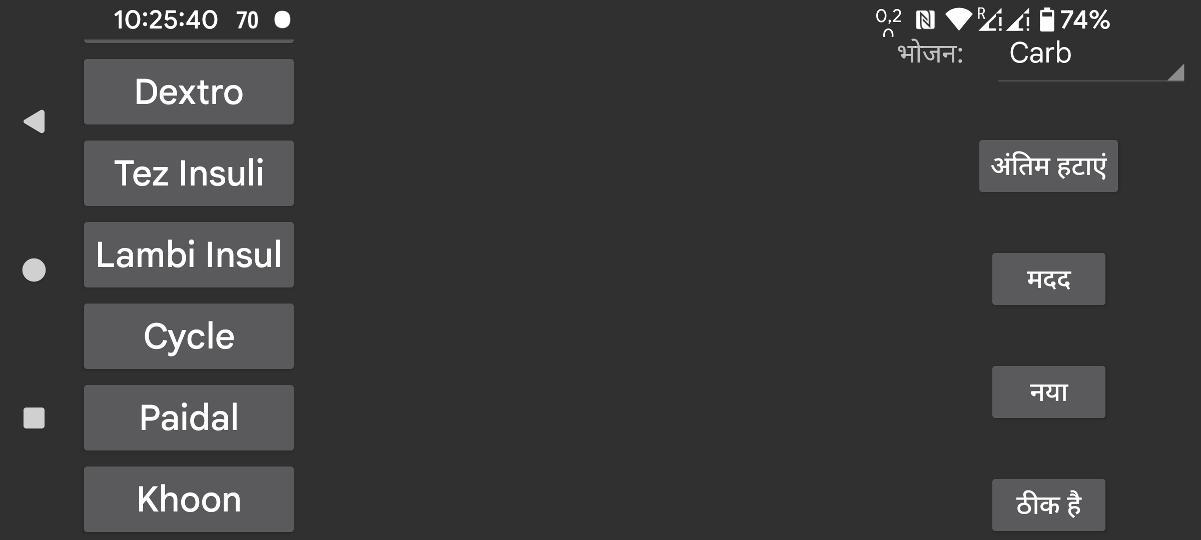 भोजन के बाद, आप चुन सकते हैं कि कौन सा लेबल भोजन की कार्बोहाइड्रेट सामग्री के लिए है। उस लेबल के लिए बाएं मध्य मेन्यू में "नई मात्रा" में एक भोजन बटन जोड़ा जाता है, जिसके द्वारा आप एक भोजन को उसकी सामग्री से निर्दिष्ट कर सकते हैं। कार्बोहाइड्रेट योग फिर इस लेबल के तहत सहेजा जाता है और आप बाद में एक सहेजे गए मान का भोजन चुनकर इस भोजन को देख सकते हैं।