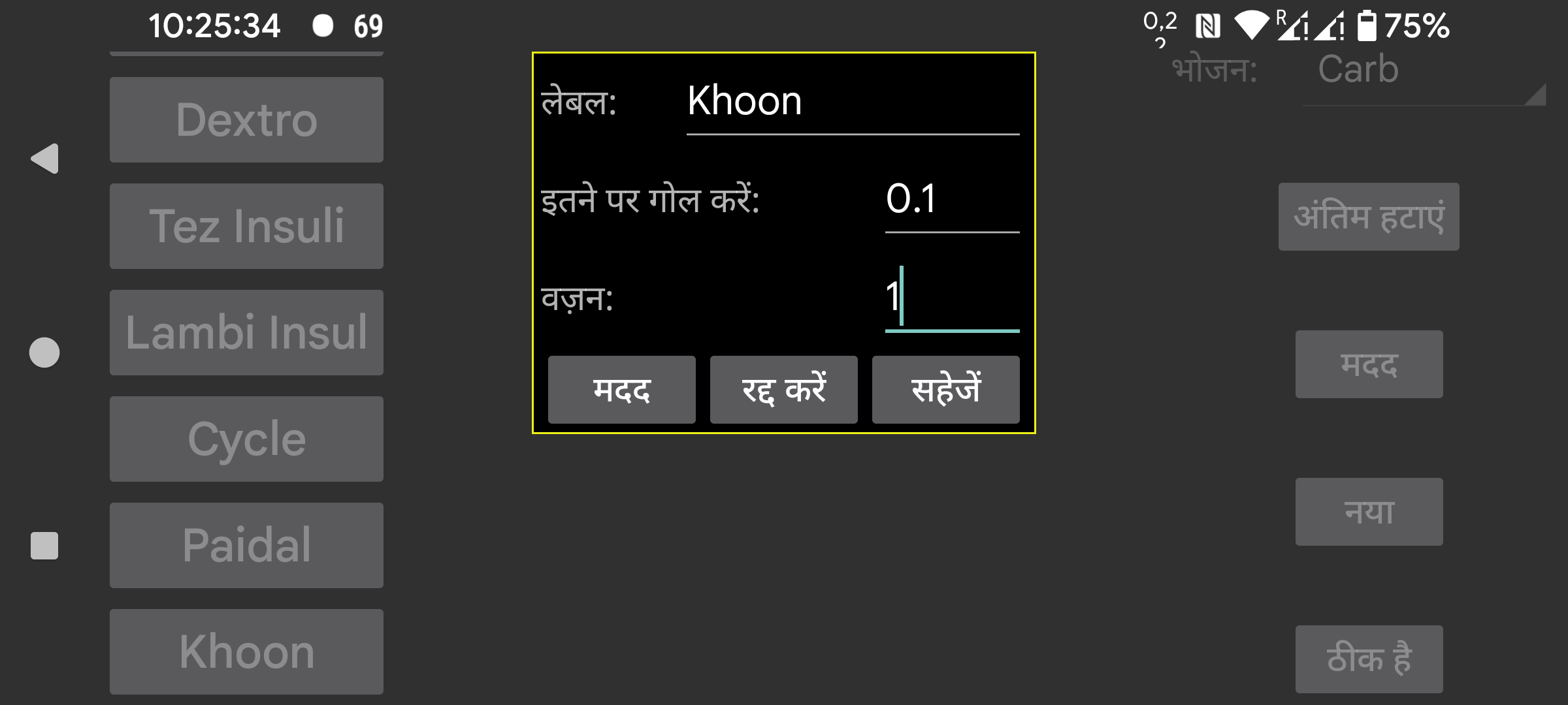 संख्याएं दर्ज करने के लिए उपयोग किए जाने वाले लेबल का नाम। आप बाएं मध्य मेन्यू में "नई मात्रा" का उपयोग करके एक निश्चित तारीख और समय से जुड़ी संख्या जोड़ सकते हैं। इन संख्याओं को ग्लूकोज ग्राफ़ में उस समय स्थिति पर या एक सूची में प्रदर्शित किया जा सकता है।