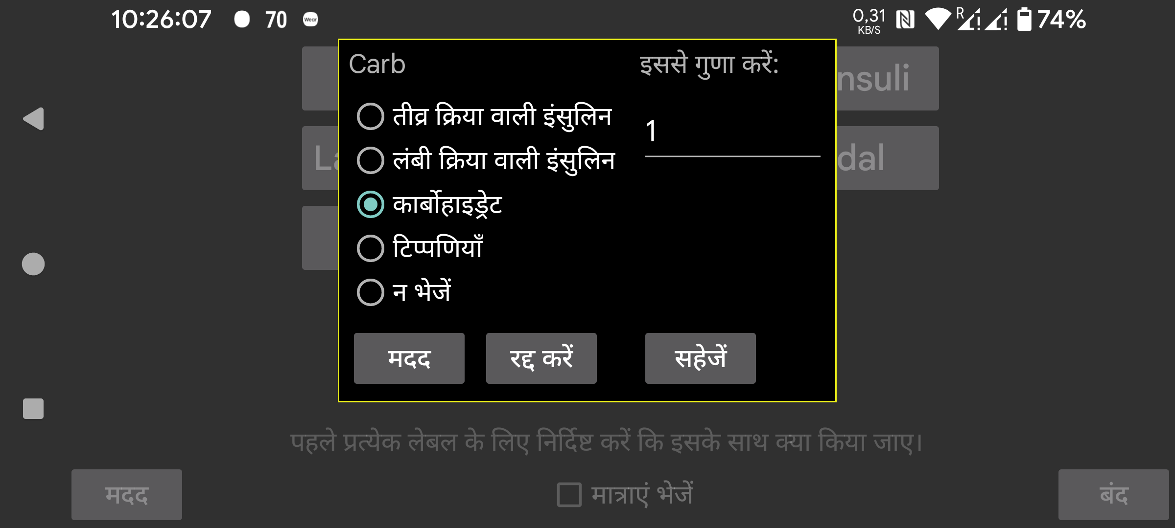 चुनें कि Juggluco में एक विशेष लेबल के तहत दर्ज की गई मात्राएं Libreview को कैसे भेजी जानी चाहिए। समान Libreview लेबल के साथ एक से अधिक प्रकार की मात्रा भेजना संभव है। उदाहरण के लिए यदि आप Juggluco में अलग-अलग लेबल के तहत कार्बोहाइड्रेट और शुद्ध ग्लूकोज भोजन को दर्ज करते हैं, तो आप दोनों के लिए निर्दिष्ट कर सकते हैं कि उन्हें Libreview को कार्बोहाइड्रेट के रूप में भेजा जाना चाहिए।
