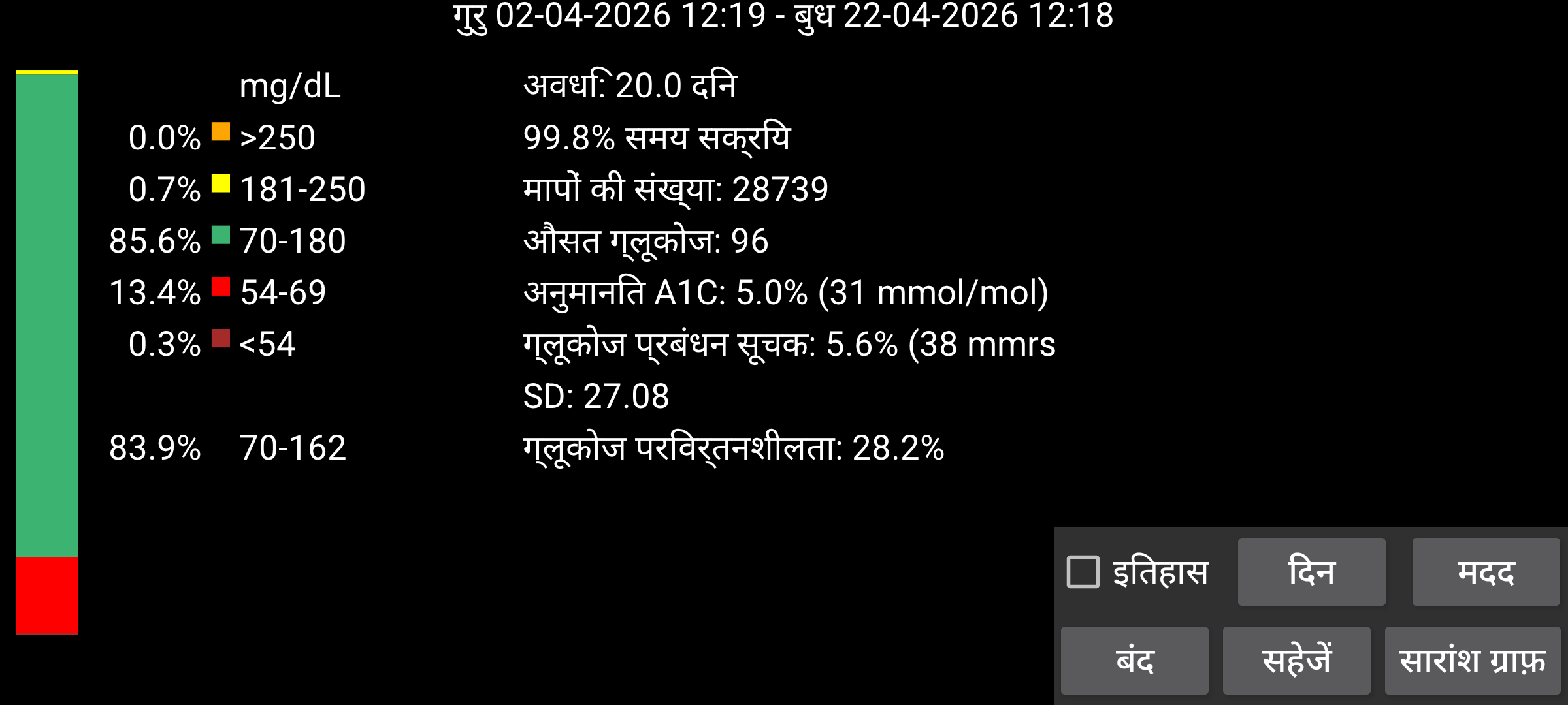स्क्रीन के बाईं ओर कुछ ग्लूकोज श्रेणियों के भीतर आने वाले मापनों का प्रतिशत है। मानक श्रेणियाँ हमेशा दिखाई जाती हैं। जब बायां मेन्यू->सेटिंग्स->डिस्प्ले में एक गैर-मानक लक्ष्य सीमा निर्दिष्ट की जाती है, तो उस लक्ष्य सीमा का श्रेणी में समय मानक श्रेणियों के नीचे प्रदर्शित होता है।