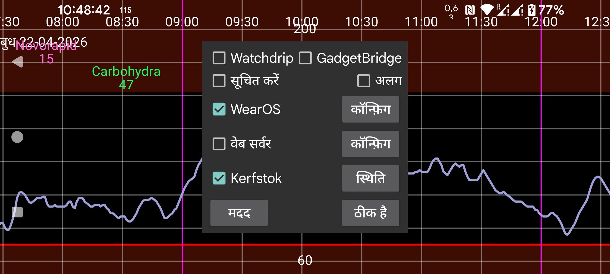 Kerfstok एक वॉच ऐप है जिसके द्वारा आप संख्याएं (जैसे इंसुलिन खुराक) दर्ज कर सकते हैं, पर यह वर्तमान ग्लूकोज मान भी प्रदर्शित करता है। नया ग्लूकोज मान आते ही, Juggluco इसे Kerfstok को भेजता है। तो Kerfstok हमेशा सबसे हाल का ग्लूकोज मान प्रदर्शित करता है। Kerfstok Garmin द्वारा समर्थित सभी गतिविधियों को रिकॉर्ड कर सकता है और गति और दूरी प्रदर्शित कर सकता है। देखें घड़ी->Kerfstok स्थिति-> मदद और https://www.juggluco.nl/Kerfstok