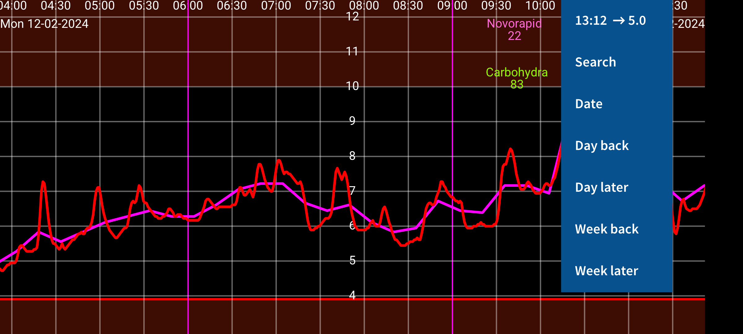 By moving left and right over the screen you can move the curve left and right. You can also move by using the movement menu on the right. Use Date to select a date, Search to search for glucose values and entered numbers. The first item of the right menu is the current time and by selecting it you jump to the right of the graph (now).