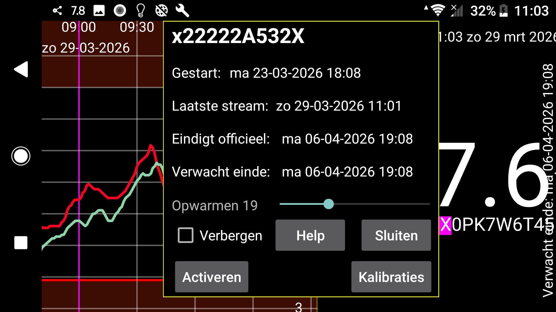 Activeren: Voor beëindigde sensoren wordt de knop “Activeren” weergegeven. Door op deze knop te drukken kun je de sensor opnieuw gebruiken zonder de datamatrix op de verpakking te scannen. Je kunt dit ook gebruiken voor Libre 2- en 3-sensoren, maar als je de sensor met Juggluco op een andere telefoon hebt gescand, moet je de sensor altijd opnieuw via NFC scannen om de sensor weer terug te krijgen.