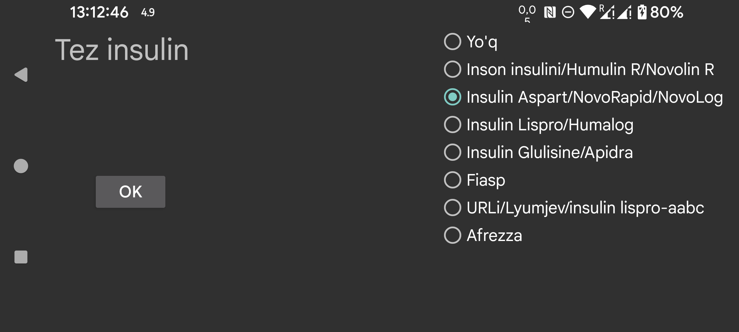 IOB - bu oldingi insulin dozalari ta'siridan qancha insulin qolganini bildiruvchi ko'rsatkich. Juggluco 9.2.0 dan oldin IOB ni taxmin qilish uchun Insulin Aspartning qondagi insulin konsentratsiyasi egri chizig'idan foydalanilgan. Endi siz insulin turini ko'rsatishingiz mumkin va Juggluco shu turga xos qondagi insulin konsentratsiyasi egri chizig'idan foydalanadi. Belgilang Yo'q agar yorliq tez ta'sir qiluvchi insulinni bildirmasa, aks holda insulin turini ko'rsating. Variantlar quyidagilar: