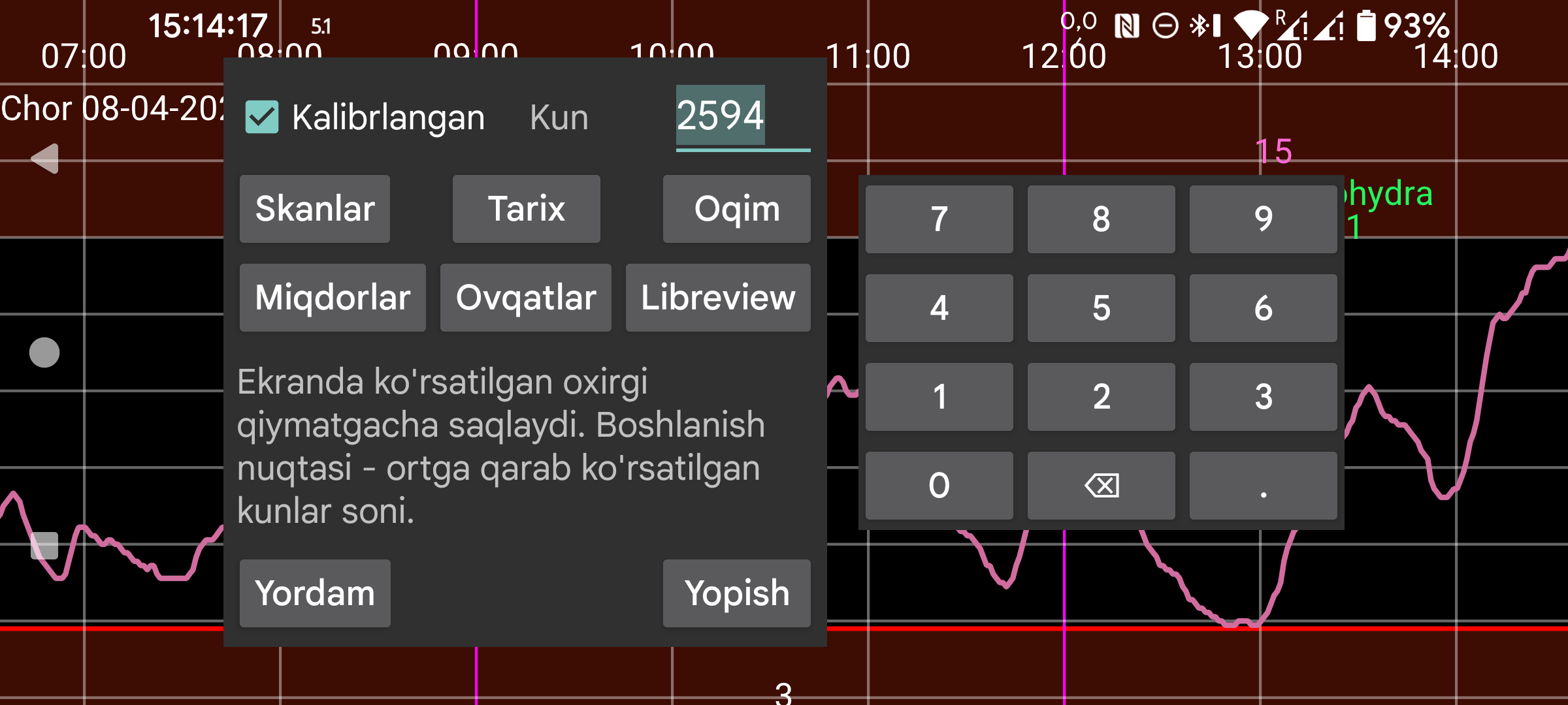 Kalibrlangan: kalibrlangan qiymatlarni saqlaydi. Bu yoqilganda Skan, Oqim va Tarix ham kalibrlangan, ham xom qiymatni saqlaydi. Libreview formatida esa mavjud bo‘lsa faqat kalibrlangan qiymat, bo‘lmasa kalibrlanmagan (xom) qiymat saqlanadi.