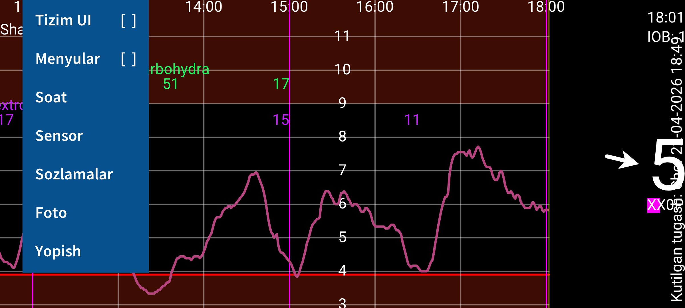 Insulin, uglevod va faollik kabi ma’lumotlarni ham istalgan yorliqlar bilan kiritish mumkin. Ular ko‘rsatilgan sana va vaqtda glyukoza grafikida belgilangan balandlikda ko‘rinadi. Grafikdagi nuqtalar yoki kiritilgan miqdorlarga tegish, shu element haqida ma’lumot beradi. Kiritilgan miqdorni uzoq bosib tahrirlash mumkin; bu chap o‘rta menyudagi ro‘yxat orqali ham amalga oshiriladi.