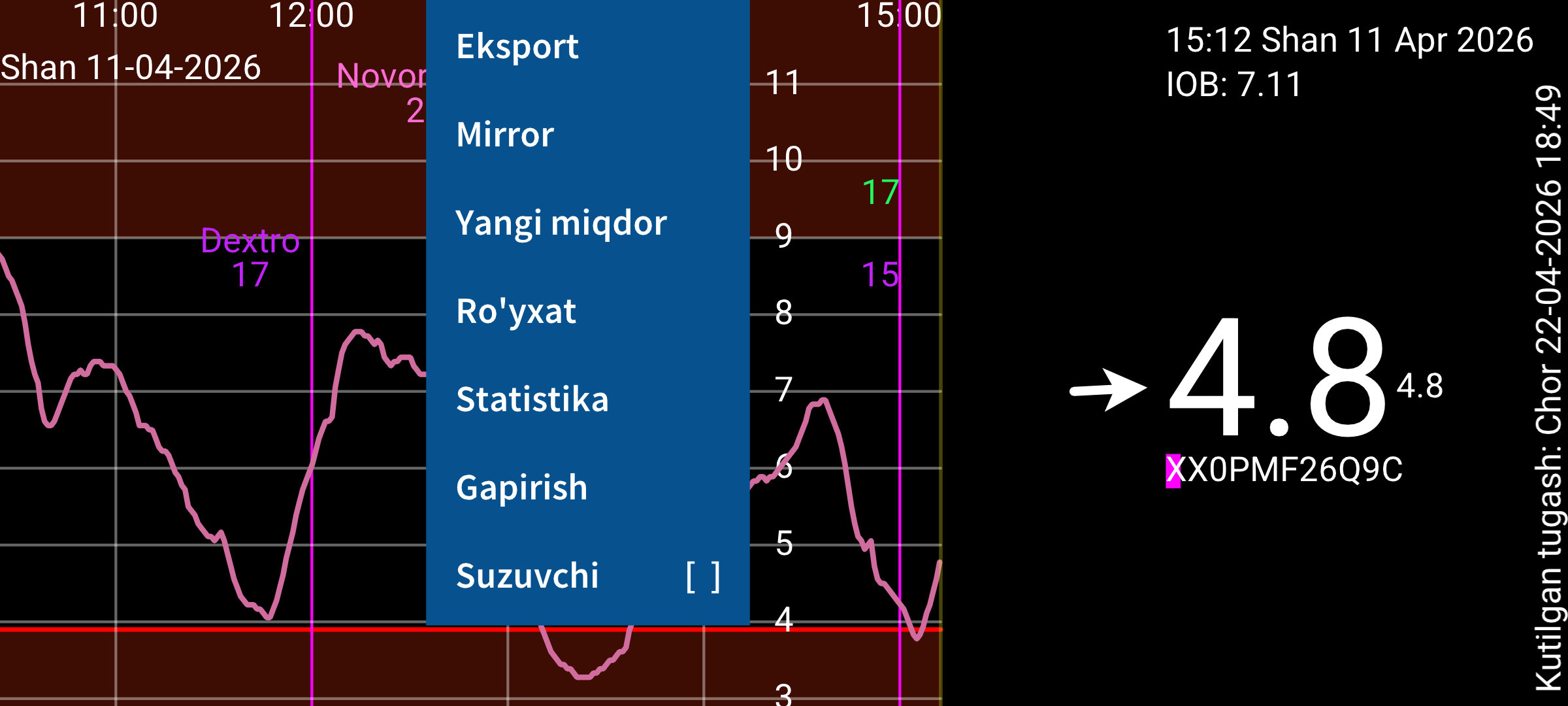 Sibionics GS1Sb, Dexcom G7/ONE+, Accu‑Chek SmartGuide, CareSens Air va Aidex X sensorlariga ulanish uchun chap menyu→Foto orqali Data Matrix kodini skan qilish kerak.