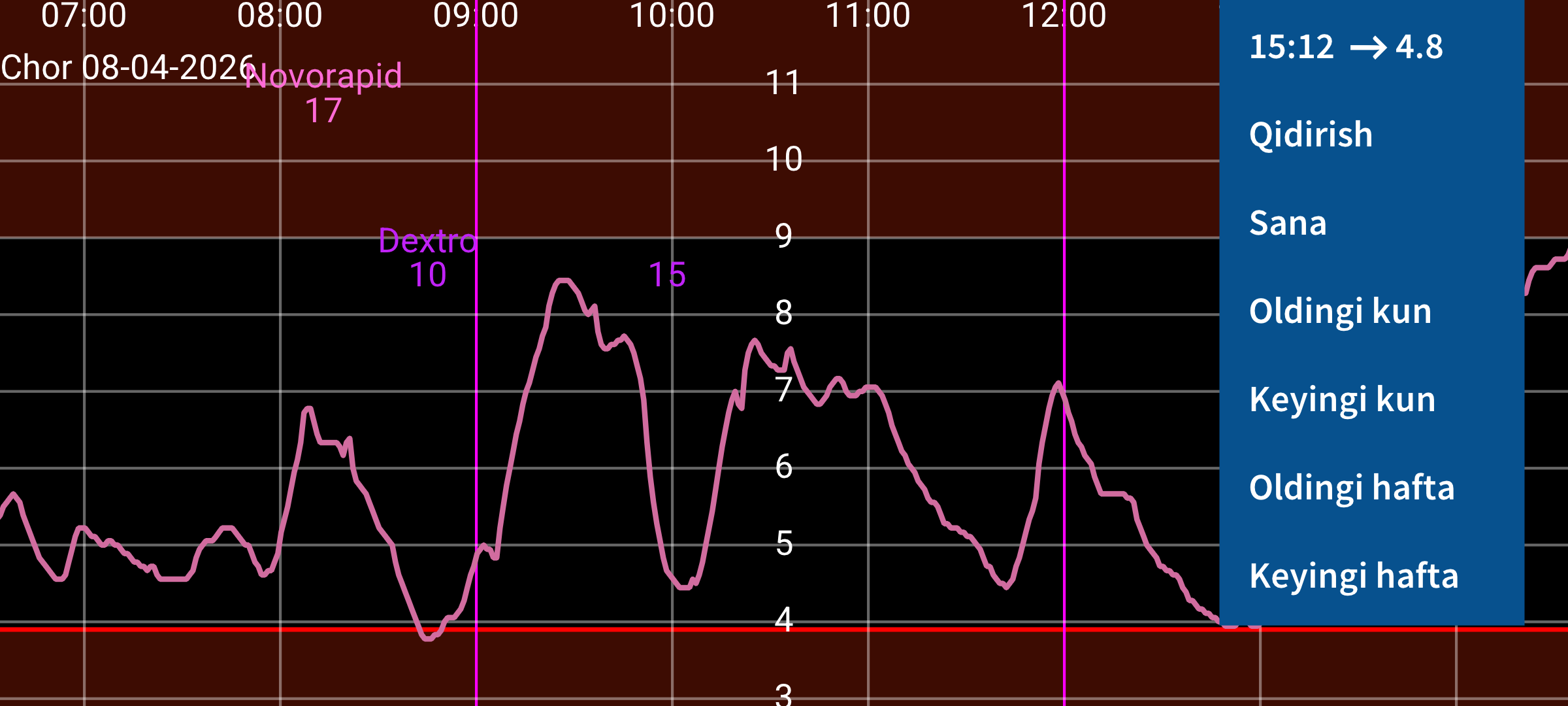 Grafikni chapga va o‘ngga siljitish uchun ekranda gorizontal surish mumkin. O‘ng tomondagi Harakat menyusi ham xuddi shu maqsadda xizmat qiladi. Sana ma’lum bir sanaga o‘tadi, Qidirish esa glyukoza qiymatlari va kiritilgan miqdorlarni topish uchun ishlatiladi. O‘ng menyudagi birinchi element joriy vaqt bo‘lib, uni tanlash grafikning eng o‘ngiga, ya’ni hozirgi vaqtga olib boradi.
