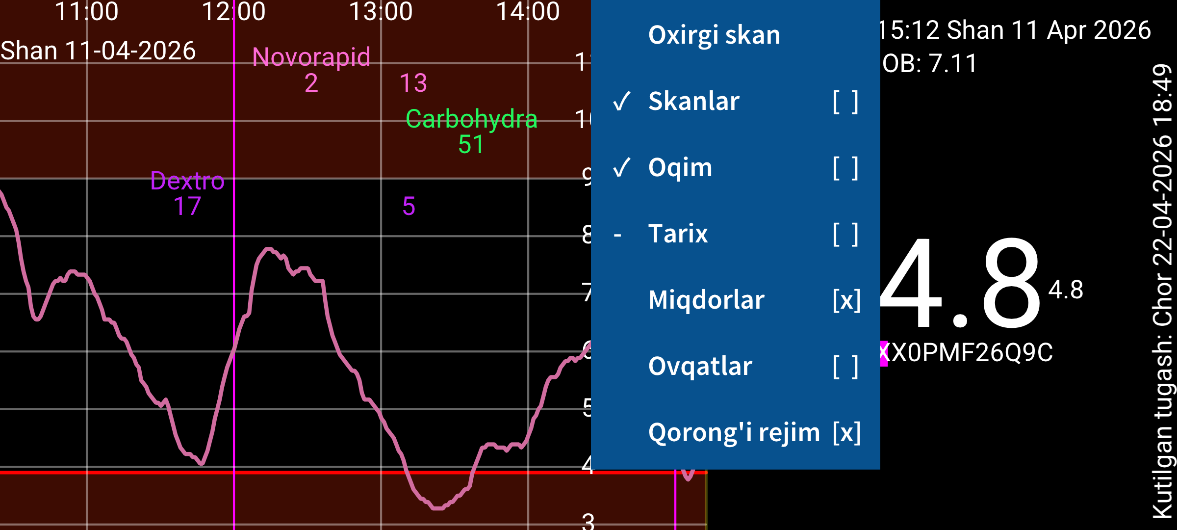 Sozlamalar orqali glyukoza birligini mmol/L yoki mg/dL ga o‘zgartirish, yorliqlarni tanlash, glyukoza signallari va dori eslatmalarini sozlash, ko‘rsatish diapazonlarini belgilash mumkin.