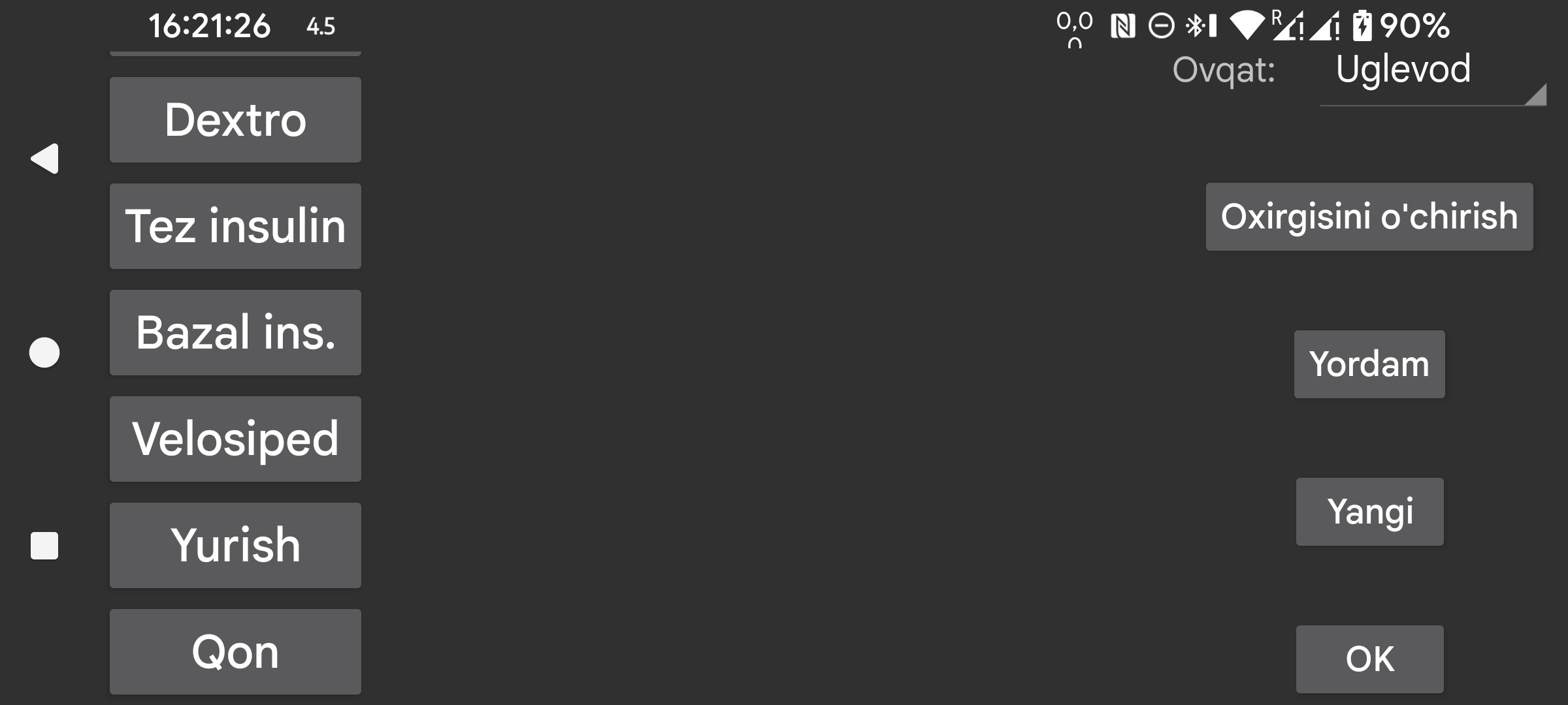 Ovqat dan keyin qaysi yorliq ovqatlardagi uglevod miqdorini bildirishi ko‘rsatiladi. Shu yorliq uchun chap o‘rta menyudagi Yangi miqdor oynasida Ovqat tugmasi paydo bo‘ladi. Shu tugma yordamida tarkibiy qismlardan iborat ovqatni kiritish mumkin. Uglevodlar yig‘indisi shu yorliq ostida saqlanadi va keyin saqlangan qiymatning ovqatini tanlab, uni qayta ko‘rishingiz mumkin.