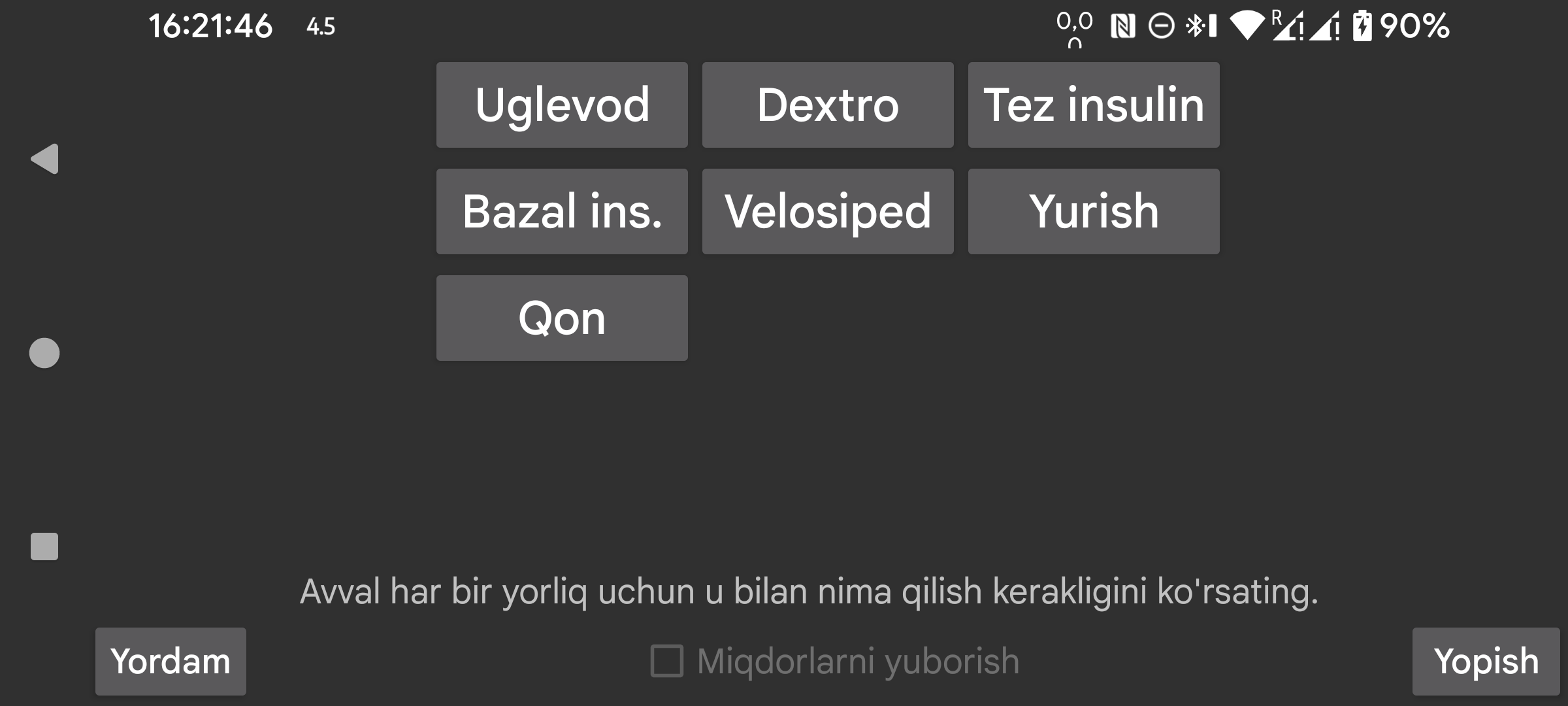 "Miqdorlarni yuborish" ni yoqing, shunda Miqdorlar Libreview’ga yuboriladi. "Miqdorlarni yuborish" ni yoqishdan oldin, har bir yorliq uchun ushbu yorliq ostida kiritilgan miqdorlar Libreview’ga qanday yuborilishini ko'rsatishingiz kerak. Yorliqlarning o'zini Chap menyu->Sozlamalar->"Raqam yorliqlari" bo'limida yaratish, o'zgartirish va o'chirish mumkin.