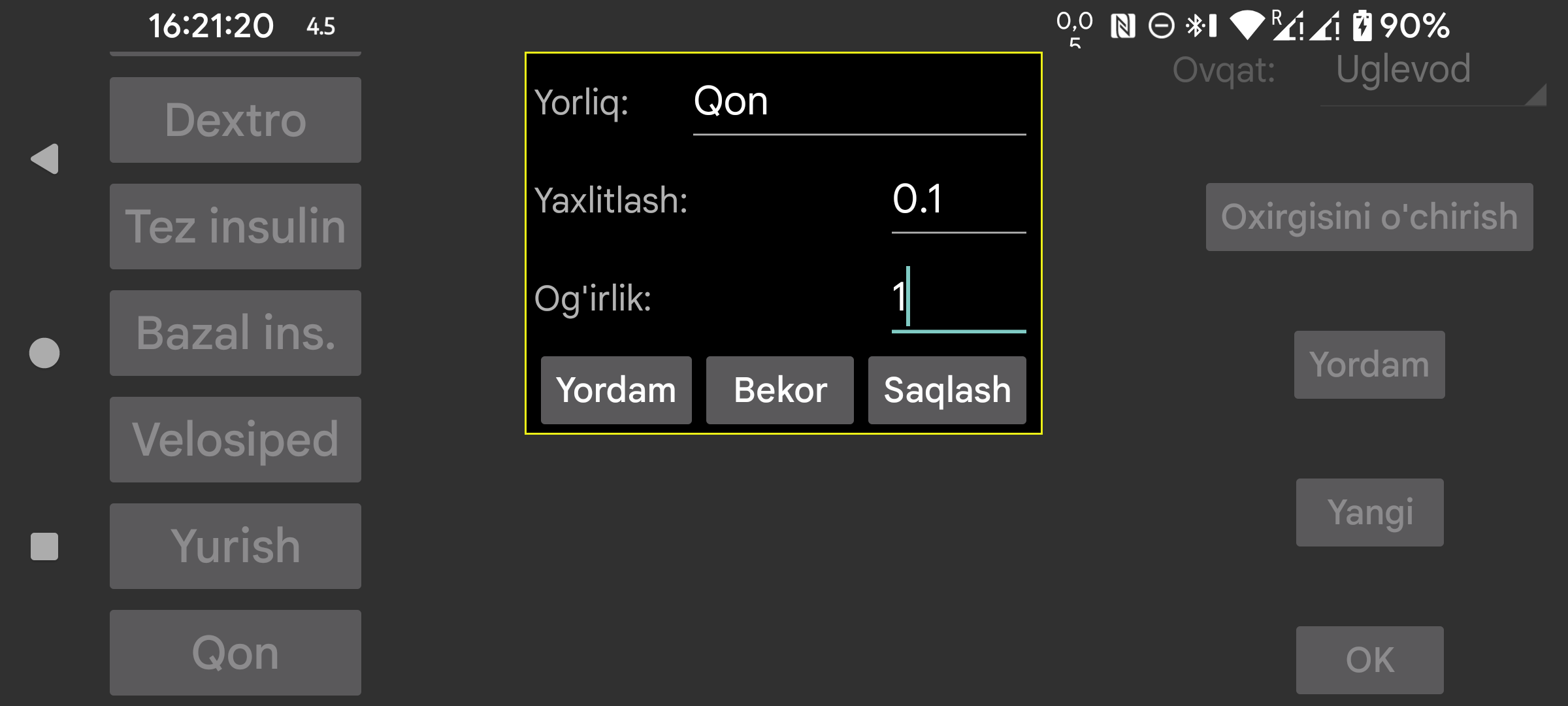 Miqdor kiritishda ishlatiladigan yorliq nomi. Chap o‘rta menyudagi Yangi miqdor orqali ma’lum sana va vaqtga bog‘langan miqdorni qo‘shishingiz mumkin. Bu miqdorlar glyukoza grafikida o‘sha vaqt nuqtasida yoki ro‘yxatda ko‘rsatiladi.