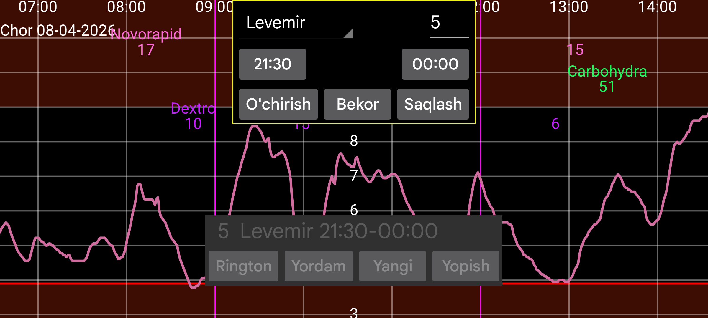 Agar shu kuni 21:30 dan keyin kamida 6 birlik Levemir kiritmagan bo‘lsangiz, 23:55 dan keyin eslatma olasiz.