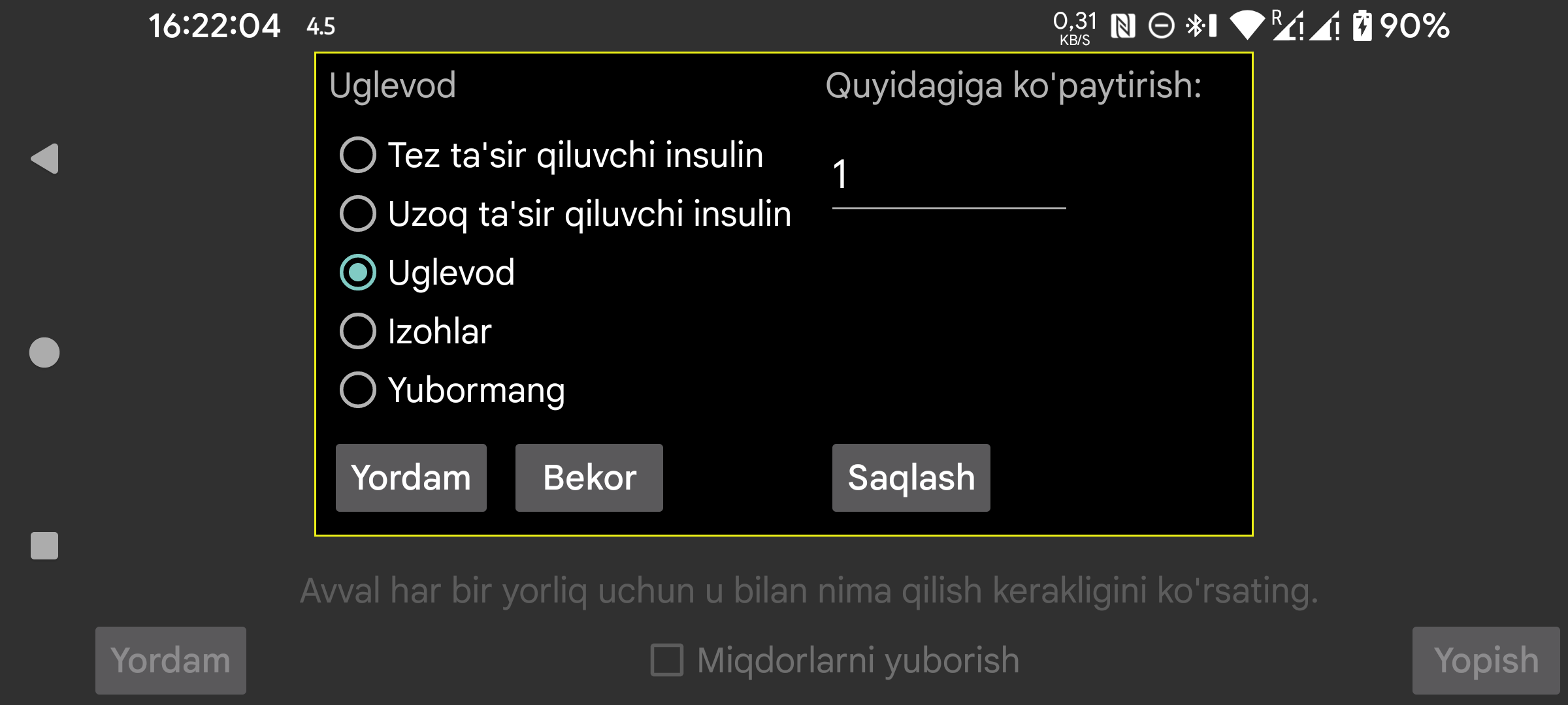 Uglevod uchun Juggluco da kiritilgan miqdorni ma’lum songa ko‘paytirish mumkin. Bu boshqa birliklardan grammga o‘tkazish uchun qulay. Masalan, Juggluco da 10 grammlik porsiyalar bilan ishlasangiz, bu yerga 10 kiritsangiz, Libreview’ga gramm yuboriladi.