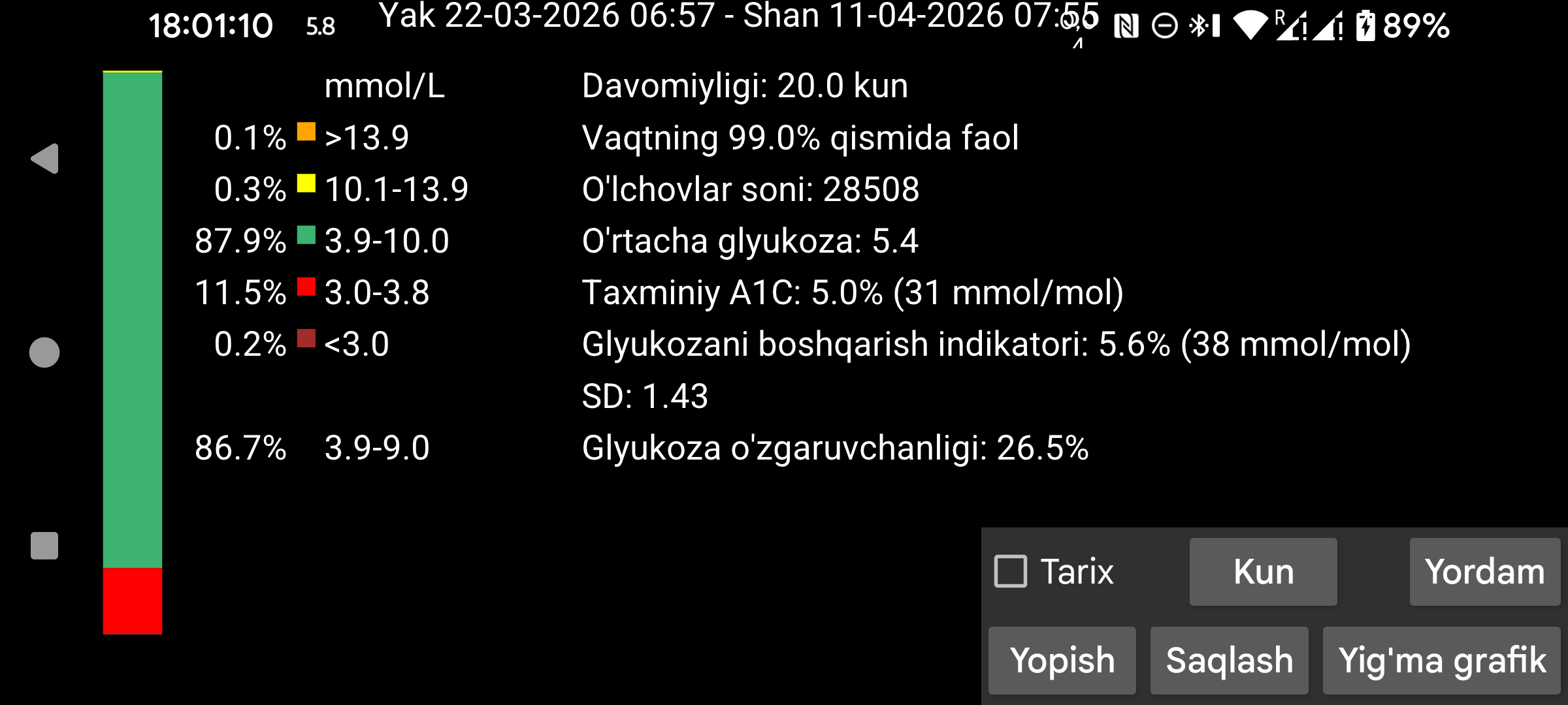 Ekran chap tomonida o‘lchovlarning ma’lum glyukoza diapazonlariga tushgan foizi ko‘rsatiladi. Standart diapazonlar doim ko‘rsatiladi. Agar chap menyu→Sozlamalar→Ko‘rsatish bo‘limida nostandart maqsad diapazoni belgilansa, shu diapazon uchun vaqt-in-range ham standart diapazonlar ostida ko‘rsatiladi.