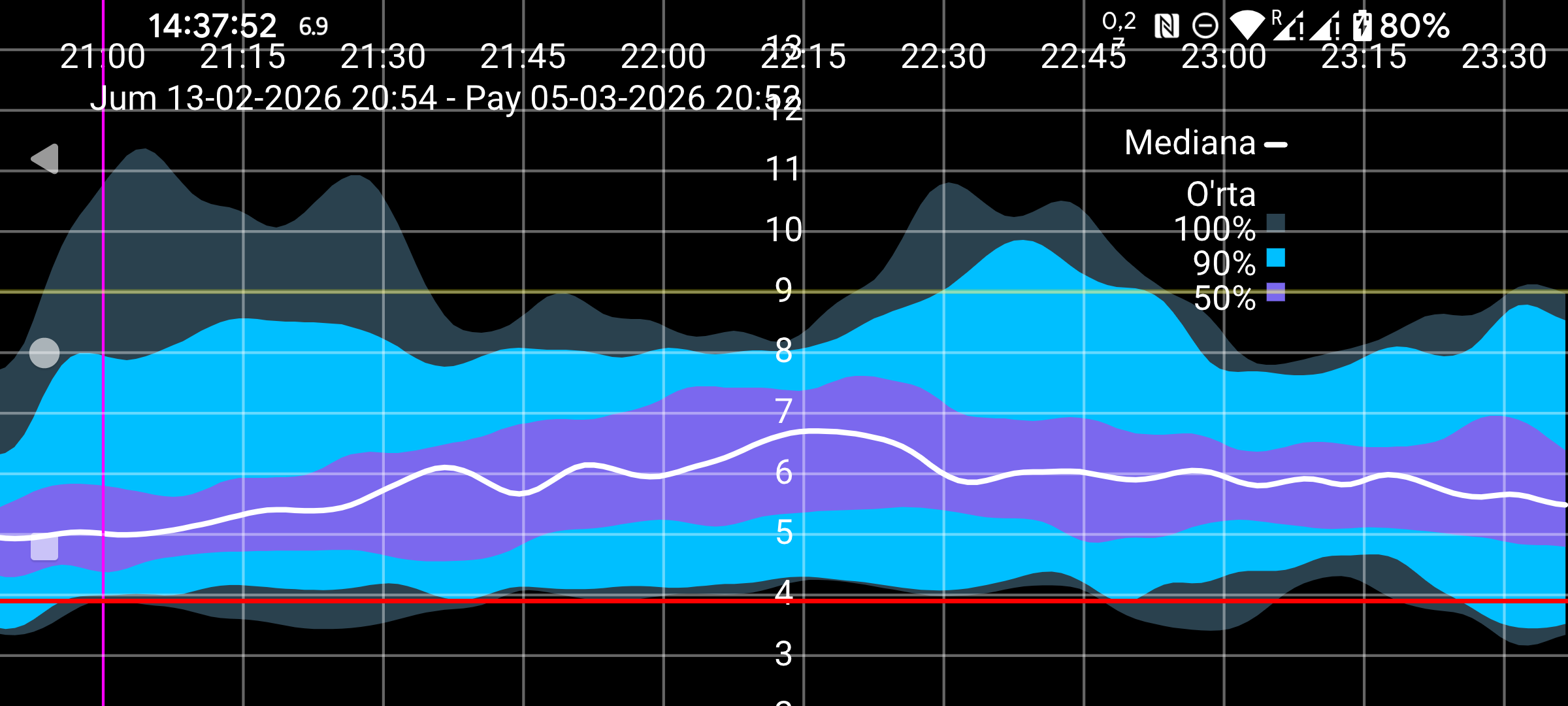 Yig‘ma grafik (kamida 9 kunlik oqim qiymatlari bo‘lganda ko‘rinadi): shu davrdagi barcha oqim qiymatlari kunning har bir daqiqasi uchun glyukozaning taqsimlanishini ko‘rsatadigan kompozit grafik chizish uchun ishlatiladi. Qora yoki oq median chiziq har daqiqada qiymatlarning 50 foizi undan past yotadigan glyukozani ko‘rsatadi. Eng och ko‘k rang barcha qiymatlar yotgan maydonni bildiradi. Sal to‘qroq ko‘k median atrofidagi 90% maydonni, eng to‘q ko‘k esa median atrofidagi 50% maydonni ko‘rsatadi. Agar bu maydon chegaralarini chiziq deb qarasangiz, ular mos ravishda 0%, 5%, 25%, 50%, 75%, 95% va 100% nuqtalarni bildiradi.
