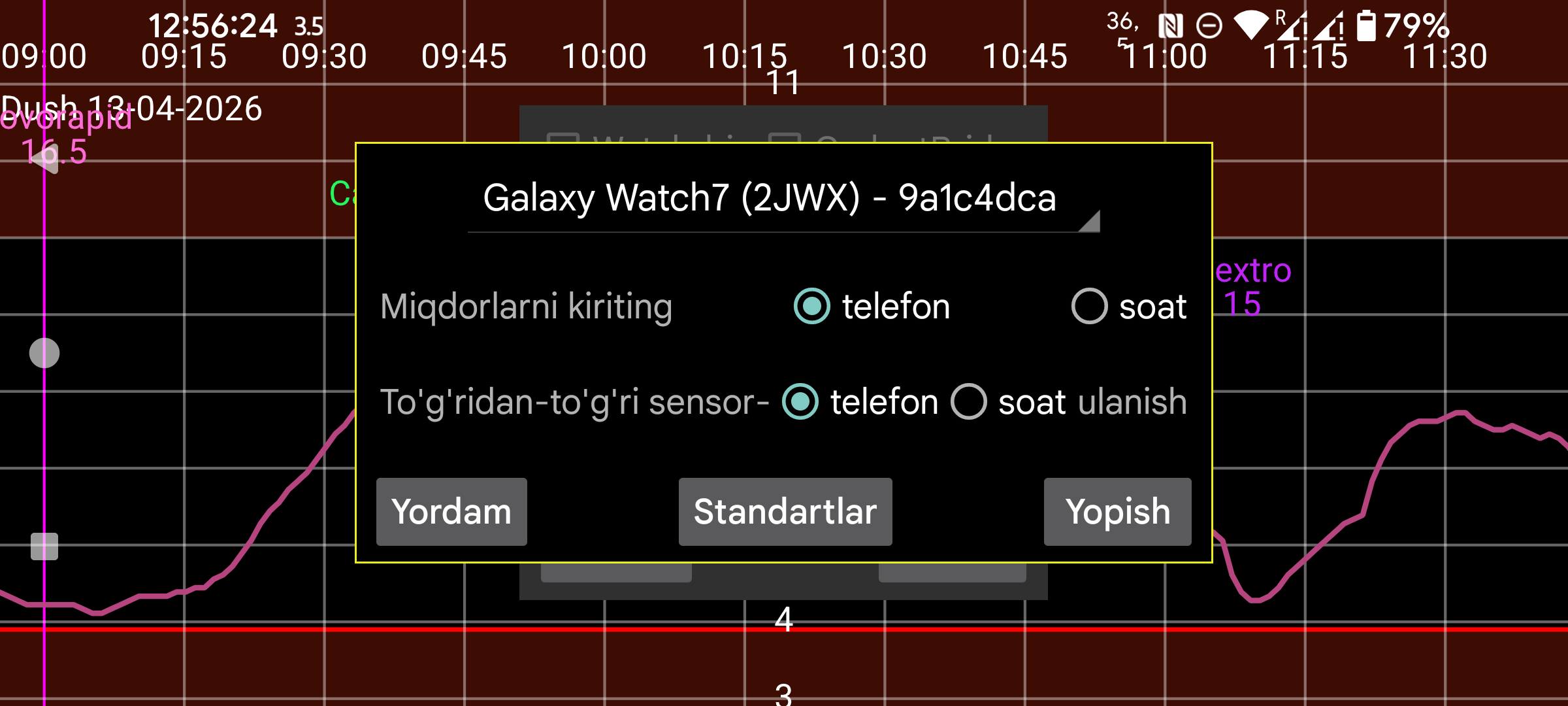 Soatda miqdor kiritish yoqilgan bo‘lsa, insulin, uglevod va faollik uchun miqdorlarni telefonda emas, soatdagi ikkinchi menyu→Miqdorlar orqali kiritasiz. Agar NovoPen’ni telefon bilan skan qilmoqchi bo‘lsangiz, bu parametrni yoqmaslik kerak. Telefon yoningizda bo‘lmasa, soatda chap menyu→Sensor→Almashtirish orqali ham shu ishni qilishingiz mumkin.